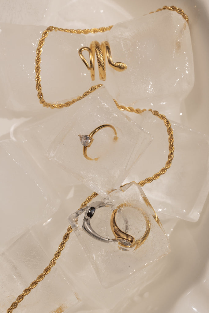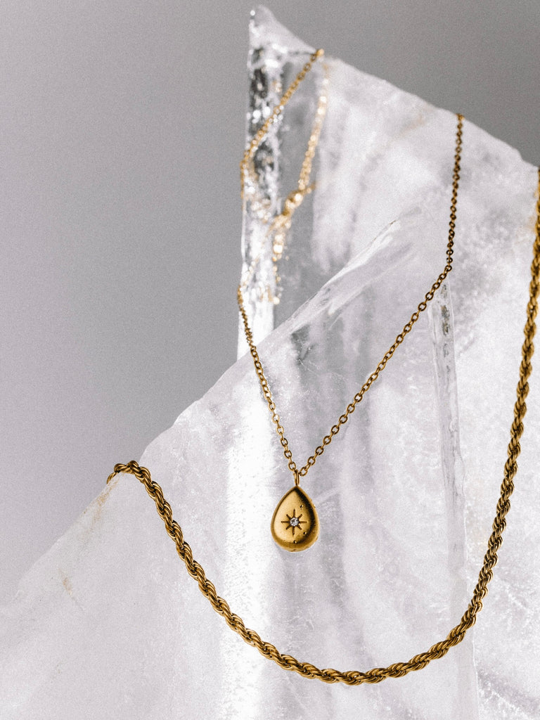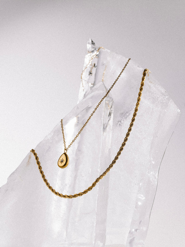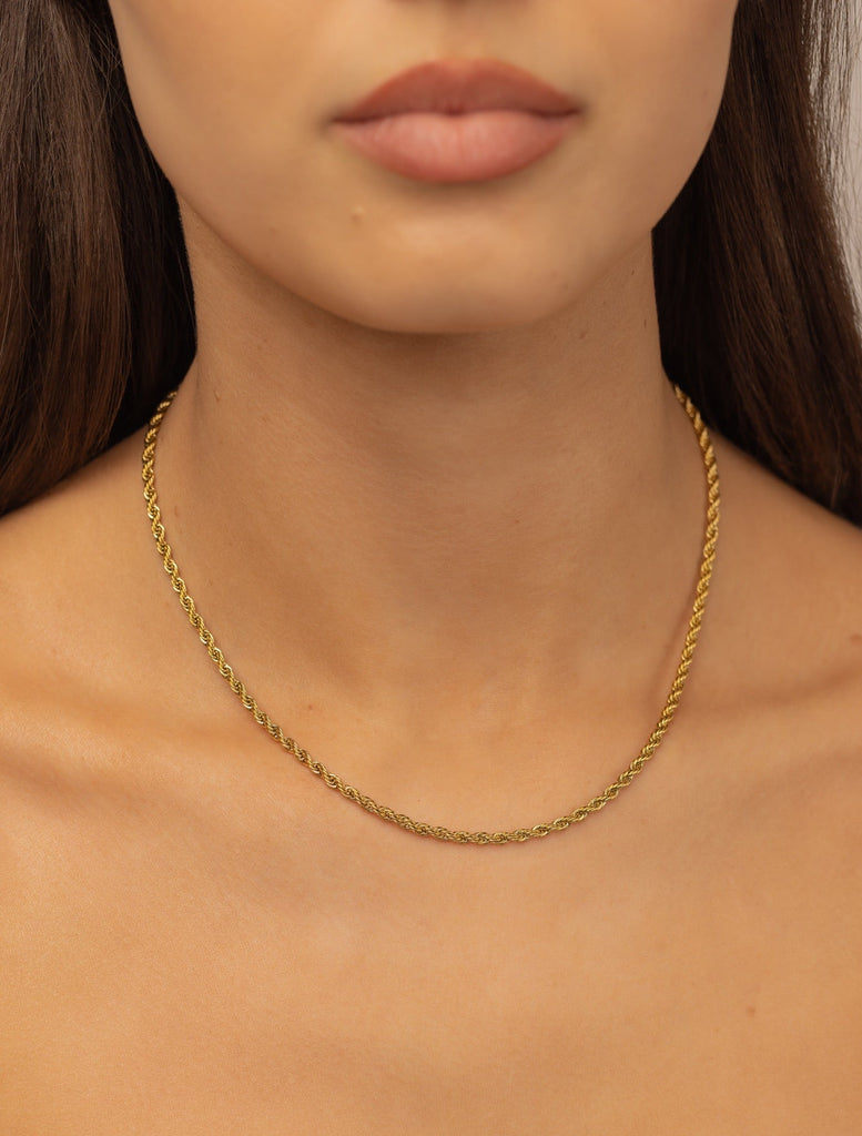 This necklace features a twist rope chain. It is made using 18k gold plated stainless steel and is waterproof. The length of the chain is 42cm with 5cm of extender chain.