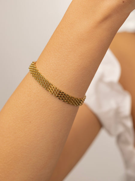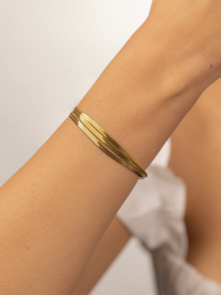 The Triple Snake Chain Bracelet is an affordable yet stylish bracelet that is made with high-quality materials. The bracelet is crafted with 18k gold plating over a base of durable stainless steel, giving it resistance to tarnishing and ensuring its longevity.