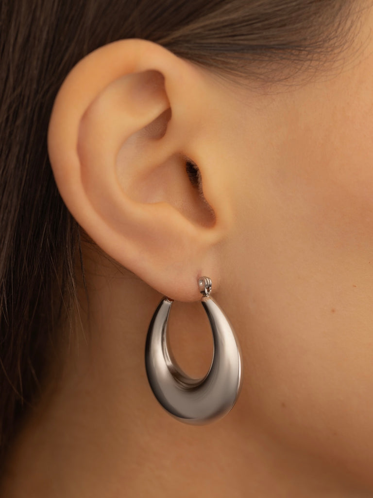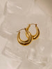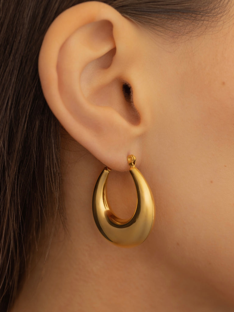 These earrings are crafted from stainless steel, plated with 18k gold and are waterproof and are suitable for everyday wear. They feature a chunky hoop design. They are approximately 3.2cm in length.